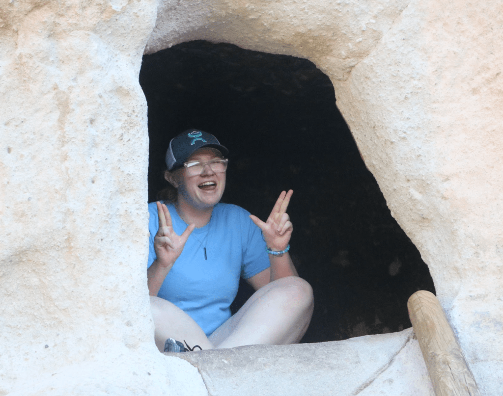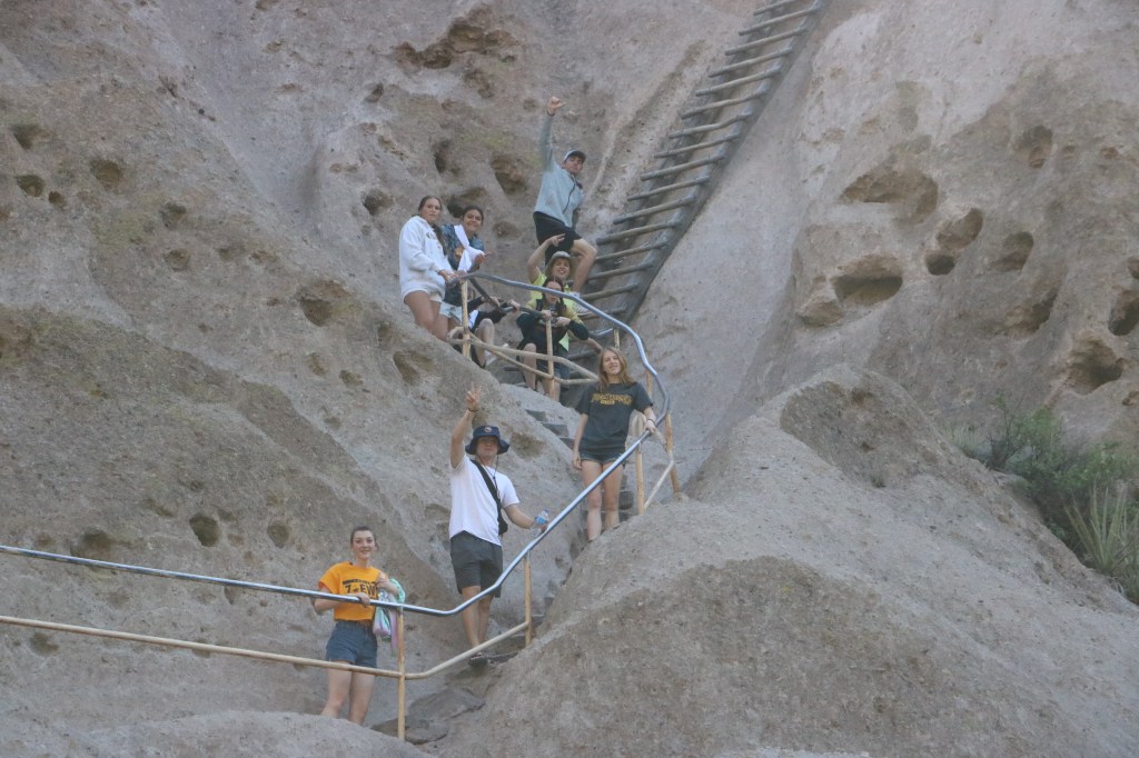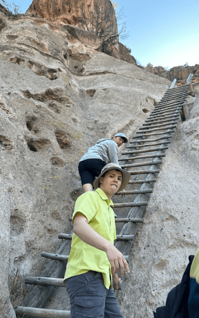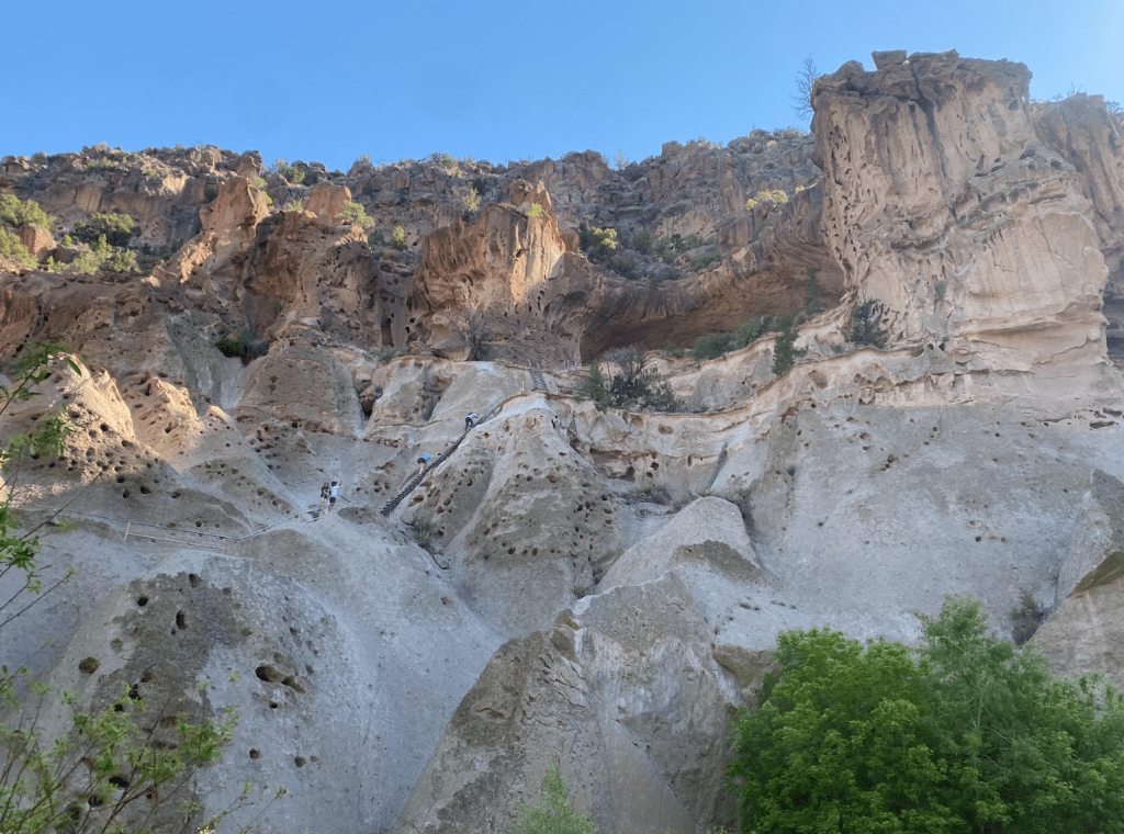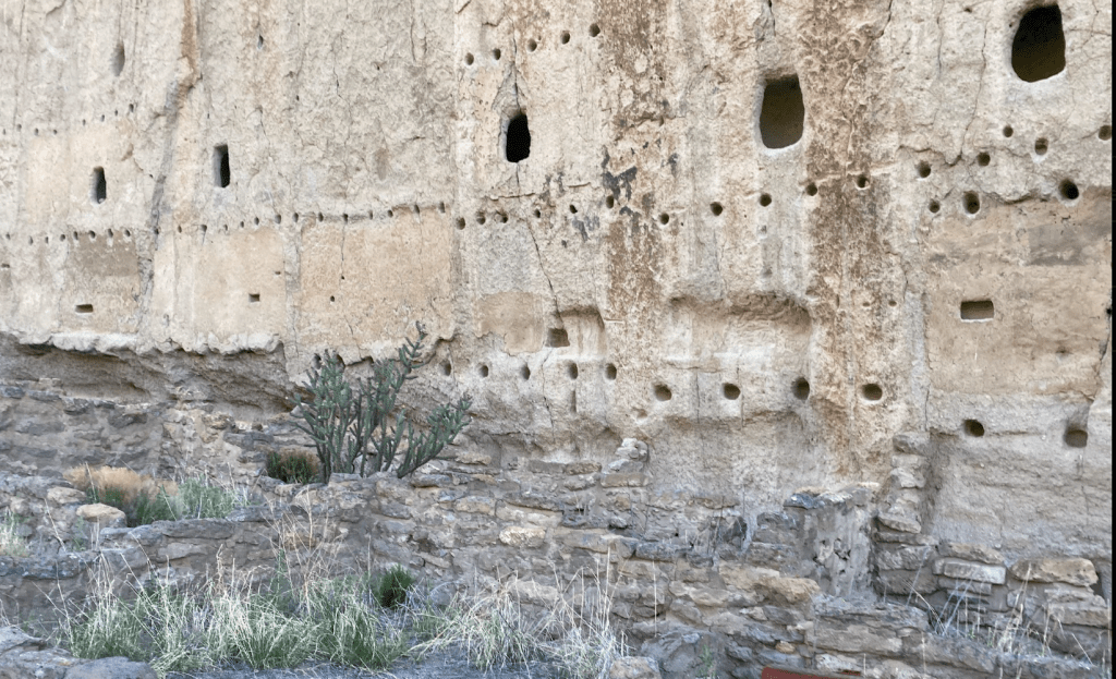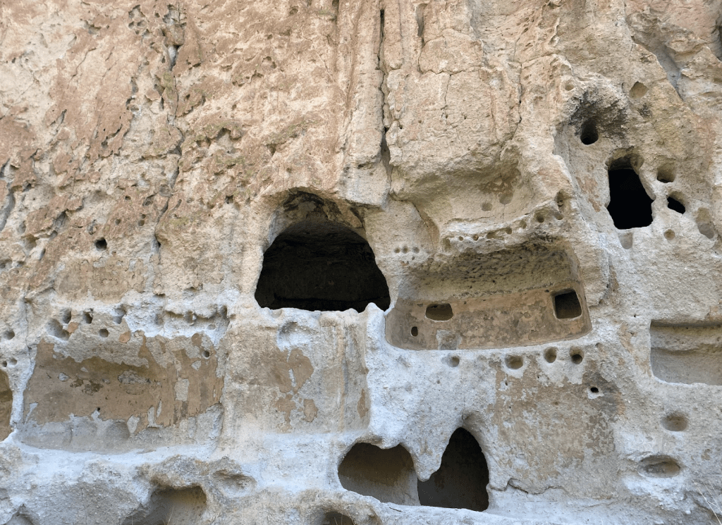 Bandelier National Monument is in beautiful Frijoles Canyon. The Puebloan people used the cavates as well as built structures in and on the ground. These look so different from Chaco Canyon’s buildings. There is also a kiva up in the cliff side, requiring a lot of ladder climbing, and a hike that ends in a waterfall. Plus, a lot of petroglyphs. The weather was perfect!