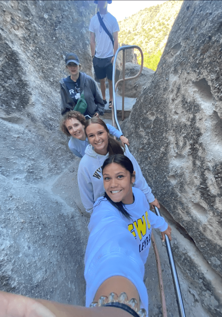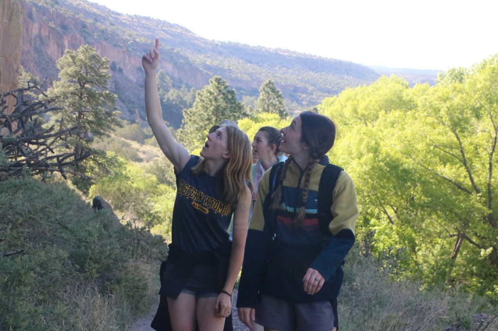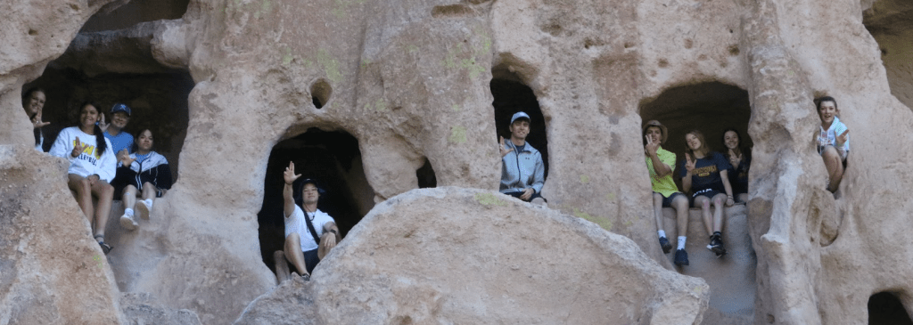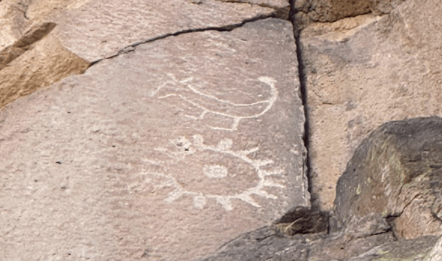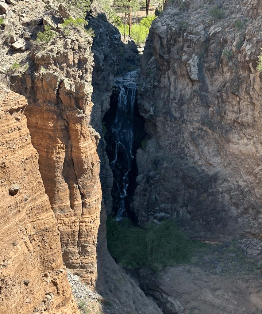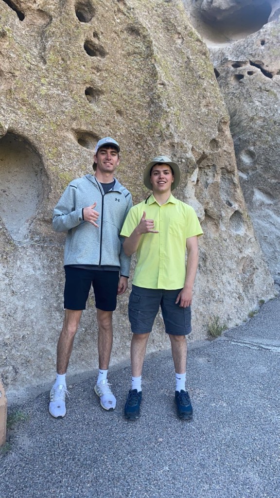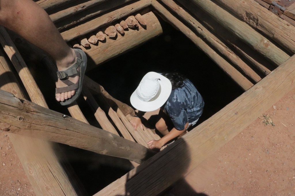 Bandelier National Monument is in beautiful Frijoles Canyon. The Puebloan people used the cavates as well as built structures in and on the ground. These look so different from Chaco Canyon’s buildings. There is also a kiva up in the cliff side, requiring a lot of ladder climbing, and a hike that ends in a waterfall. Plus, a lot of petroglyphs. The weather was perfect!